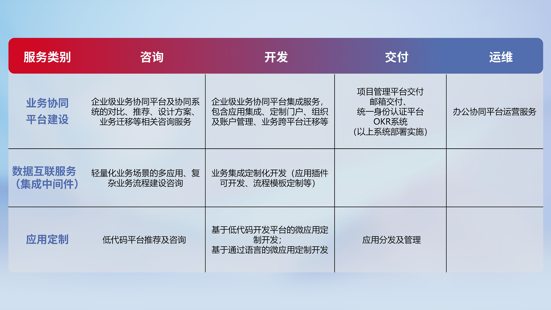 针对钉钉、、、、企微、、IDaas等平台级产品提供产品的规划、、、、方案、、交付、、定制化开发等服务,,,,实现如统一协同办公、、智能客户服务、、混合会议管理、、、智能数据查询、、等业务场景,,,实现数字化转型。。。。